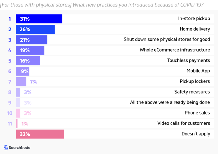 Servicios de recogida en tienda, entregas a domicilio, aplicaciones móviles, pagos digitales sin contacto e incluso el cierre de algunas de las tiendas fueron los mas populares, sin embargo el pago sin contacto, lockers para recogida y venta telefónica también estuvieron en la lista